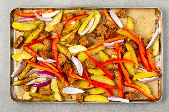 Eine dankbare Alternative zum alteingesessenen Klassiker der deutschen Fast-Food-Szene, Pommes rot-weiß, auch bekannt als „Pommes Schranke“: Hier sind unsere veganen „Loaded Fries“, also Fritten mit buntem Topping! Dich erwartet eine köstliche Aromenvielfalt, denn Paprika, Zwiebeln und pflanzliches „Fleisch“ werden gut gewürzt, mit den Kartoffeln knusprig gebacken und mit Tomatensalsa und Ranchdressing serviert. Yummy!