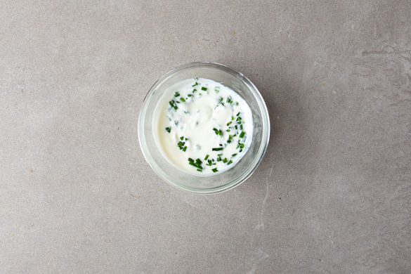 Währenddessen den Knoblauch schälen und fein hacken. Den Schnittlauch in feine Röllchen schneiden. Den Joghurt mit Salz und Pfeffer abschmecken und den Schnittlauch unterrühren.