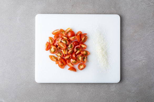 Die Kirschtomaten vierteln. Den Käse fein reiben.
