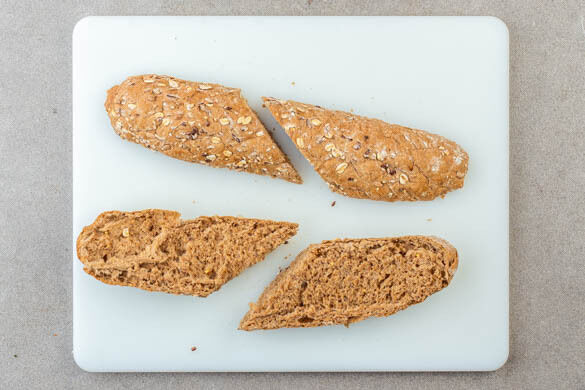 Die Brötchen auf einem mit Backpapier ausgelegten Backblech im Ofen 4–5Min. aufbacken. Währenddessen die Minzeblätter von den Stängeln zupfen und grob schneiden. Die Brötchen etwas abkühlen lassen, dann aufschneiden und jede Brötchenhälfte quer halbieren.