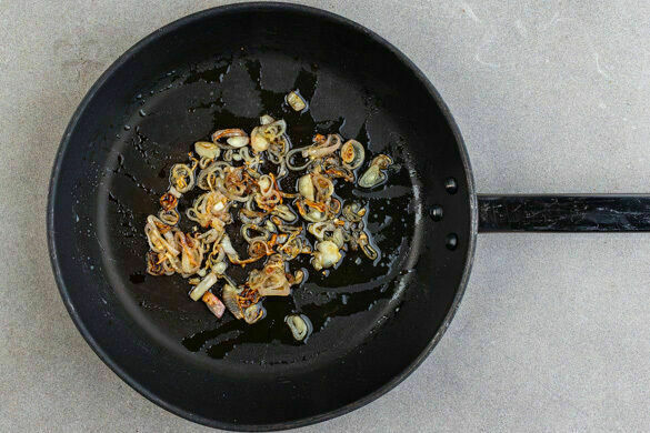 Die Schalotten schälen, in dünne Ringe schneiden und in einer kleinen Pfanne mit 2EL Olivenöl bei mittlerer Hitze 2–3Min. anbraten. 1TL Zucker hinzufügen und die Schalotten ca. 5Min. karamellisieren, bis sie braun und leicht knusprig sind. Die Hitze ggf. etwas reduzieren. Mit 1 Prise Salz würzen.