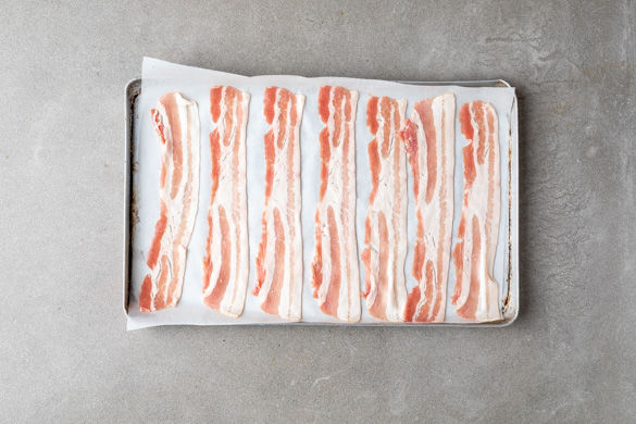 Die Baconscheiben auf ein mit Backpapier ausgelegtes Backblech legen und im Ofen in ca. 9–12Min. knusprig backen.