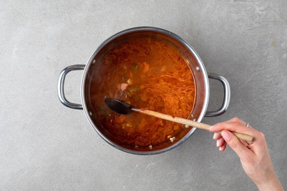 Den Sellerie, die Karotten, die Zwiebeln und den Knoblauch in einem großen Topf mit 1EL Olivenöl bei mittlerer Hitze ca. 2–3Min. anbraten. Ca. die 1/2 des Tomatenmarks hinzugeben und 1Min. mitbraten. Mit 1,5L Wasser ablöschen, die Geflügelbrühwürfel hinzugeben und die Minestrone ca. 5Min. bei niedriger Hitze köcheln lassen.