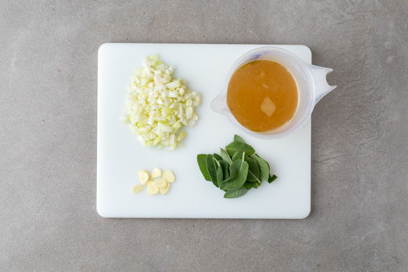 Die Zwiebel schälen, halbieren und in feine Würfel schneiden. Den Knoblauch schälen und fein hacken. Die Salbeiblätter von den Stängeln zupfen. 700ml Wasser in einem Wasserkocher aufkochen und den Brühwürfel im heißen Wasser auflösen.