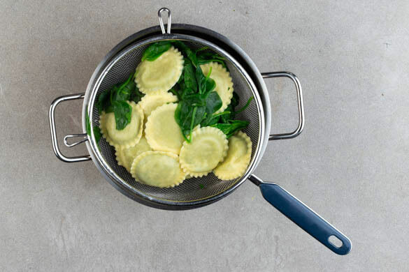 Die Pasta in das kochende Wasser geben und in ca. 3Min. bissfest kochen. Den Spinat in den Topf zu der Pasta geben und für die letzten ca. 30Sek. mitkochen. Die Pasta und den Spinat in ein Sieb abgießen und abtropfen lassen.