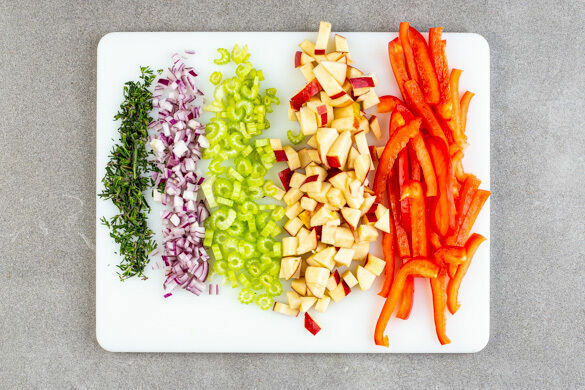 Die Paprika vierteln, entkernen und in dünne Streifen schneiden. Den Sellerie in dünne Scheiben schneiden. Die Äpfel vierteln, entkernen und in 1–2cm große Stücke schneiden. Die übrigen Zwiebelhälften grob würfeln. Den Estragon grob schneiden.