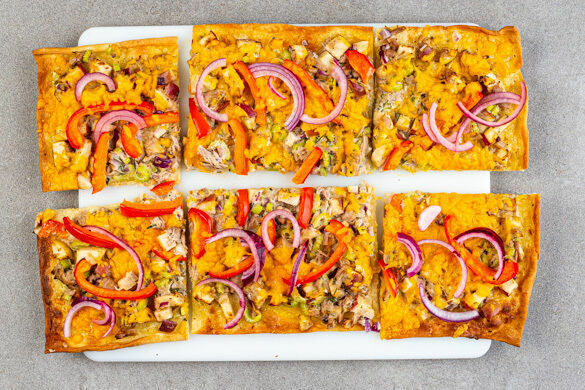 Die Thunfisch-Mischung gleichmäßig auf den vorgebackenen Teigen verstreichen und die Paprika darauf verteilen. Mit dem Käse bestreuen und die Flammkuchen weitere 7–8Min. im Ofen backen, bis der Käse geschmolzen und der Teig knusprig ist.