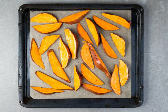 Den Backofen auf 220°C (200°C Umluft) vorheizen. Die Süßkartoffel längs halbieren und in ca. 2cm dicke Spalten schneiden. Mit 2TL Olivenöl sowie ½TL Salz vermengen und auf einem mit Backpapier ausgelegten Backblech im Ofen in 25–30Min. goldbraun backen.