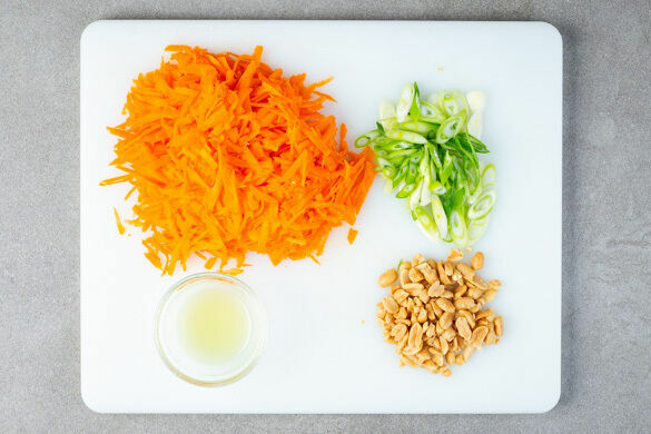 Die Karotte ggf. schälen und grob raspeln. Die Lauchzwiebel schräg in feine Ringe schneiden. Die Erdnüsse grob hacken. Die Limette halbieren und auspressen.