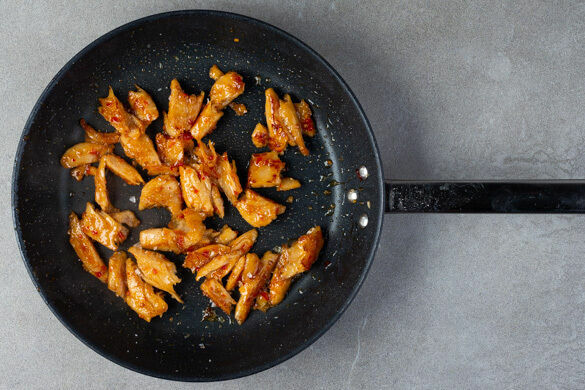 Das Veggie-Fleisch in einer mittelgroßen Pfanne mit 1EL Olivenöl bei mittlerer bis starker Hitze auf jeder Seite 2–3Min. braten. Anschließend die Sweet-Chili-Sauce dazugeben und ½–1Min. mitbraten, bis die Sauce etwas eingedickt und das Veggie-Fleisch vollständig davon bedeckt ist. Mit Salz abschmecken.