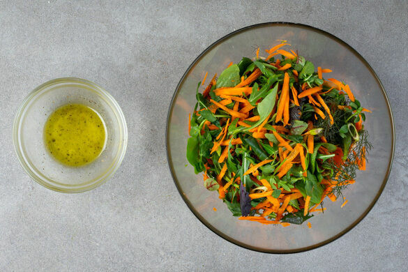 Den Wildkräutersalat, die Karotten und die Lauchzwiebeln mit 1EL Limettensaft, 1EL Olivenöl sowie je 1 Prise Salz und Pfeffer vermengen. Die Süßkartoffeln, das Veggie-Fleisch und den Salat auf Teller verteilen und mit den Erdnüssen garniert servieren. Den Limetten-Dip dazu reichen.