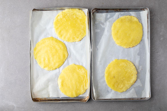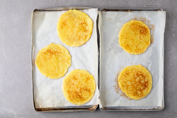 Die Taler aus dem Ofen nehmen, vorsichtig vom Backpapier lösen und auf die andere Seite drehen. Tipp: Falls sie sich schwer lösen, die Taler weitere 1–2Min. backen.