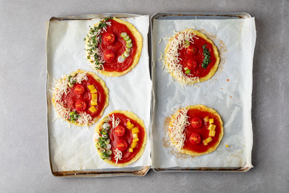 Die passierten Tomaten mit dem Basilikum verrühren und mit Salz und Pfeffer würzen. Die Taler mit 1–2EL Tomatensauce bestreichen und mit Paprika, Tomaten und Lauchzwiebeln belegen. Den Käse darüberstreuen und die Taler weitere 5–8Min. backen, bis der Käse geschmolzen ist.