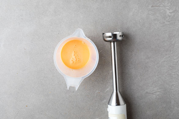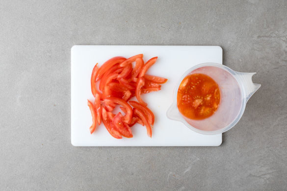 Die Tomaten vierteln, dabei den Strunk entfernen. Das Kerngehäuse herausschneiden und in ein höheres Gefäß geben. Die Tomatenfilets in ca. 0,5cm dünne Streifen schneiden.