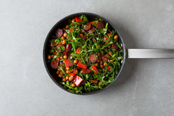 Das Chorizo-Gemüse mit 2–3TL Essig (am besten Balsamicoessig) ablöschen, dann die Paprika hinzugeben und gut untermischen. Weitere 5Min. braten, bis die Kichererbsen anfangen, knusprig zu werden. Nach Wunsch mit Salz und Pfeffer abschmecken. Vorsicht: Die Chorizo und der Ziegenkäse sind bereits sehr salzig.