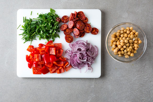 Den Backofen auf 180°C Umluft oder 200°C Ober-/Unterhitze vorheizen. Die Chorizo in 0,5cm dicke Scheiben schneiden. Die Kichererbsen in ein Sieb abgießen und kurz abspülen. Die Zwiebel schälen, halbieren und in dünne Halbringe schneiden. Die Paprika halbieren, entkernen und in 2cm große Würfel schneiden. Die Petersilie und den Schnittlauch grob hacken.