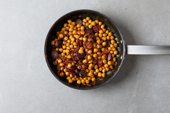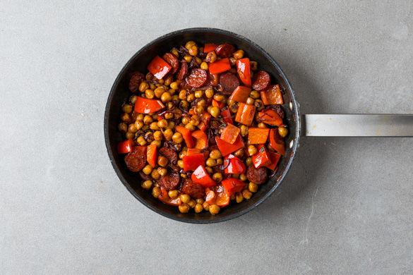 Die Chorizo in einer mittelgroßen Pfanne mit 1EL Olivenöl bei mittlerer Hitze 2–3Min. anbraten. Dann die Hitze reduzieren, die Zwiebeln hinzugeben und kurz anbraten. Die Kichererbsen und 2TL Paprikapulver zugeben, alles gut vermischen und weitere 2–3Min. braten. Nach Geschmack kann auch mehr Paprikapulver verwendet werden.