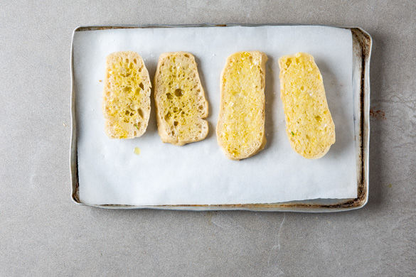Den Knoblauch schälen, fein hacken und mit 1EL Olivenöl mischen. Die Baguettebrötchen in Scheiben schneiden, mit dem Knoblauchöl beträufeln und auf einem mit Backpapier belegten Backblech im Ofen in 5–6 Min. goldbraun backen. Herausnehmen und beiseitestellen.