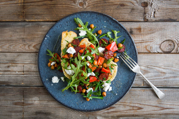 Wurstbrot olé heißt es heute, wenn du dir aus Chorizo und Kichererbsen einen köstlich-knusprigen Brotbelag zauberst, der auf geröstetem Knoblauchbaguette und mit Ziegenkäse gekrönt serviert wird. Weckt den Spanier in dir!