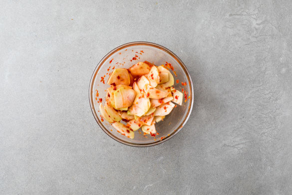Die Limettenschale fein abreiben, dann die Limette halbieren und auspressen. Das Sambal Oelek mit dem Mirin und 1–2EL Limettensaft verrühren.