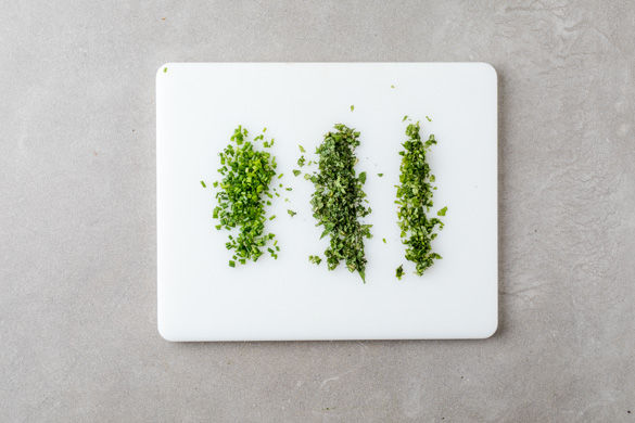 Die Basilikum- und die Minzeblätter von den Stängeln zupfen und fein hacken. Den Schnittlauch in feine Röllchen schneiden.