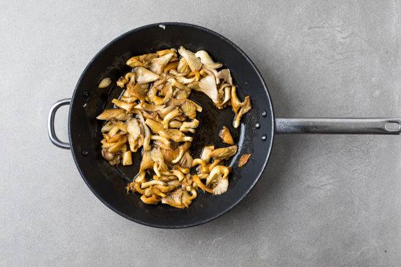 Die Austernpilze mit etwas Küchenkrepp putzen und mit den Händen in ca. 2–3cm große Stücke zerteilen. In einer großen Pfanne bei mittlerer Hitze ca. 3–5Min. goldbraun anbraten. Den Limettenabrieb, den restlichen Limettensaft und den Orangensaft hinzugeben und mit 1EL Sojasauce, Salz und Pfeffer würzen.