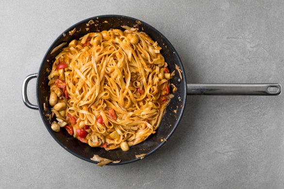Das Pesto mit der Pasta vermischen, dabei etwas Pastawasser dazugeben, bis die Pasta gleichmäßig von Sauce überzogen ist. Nach Geschmack mit Salz und Pfeffer nachwürzen. Die Tomaten-Pilz-Pfanne unterheben, Pasta auf Teller verteilen und mit restlichem Basilikum und gerösteten Mandeln garniert servieren.
