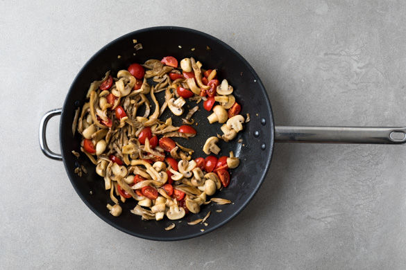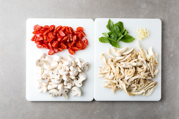 In einem großen Topf ausreichend leicht gesalzenes Wasser für die Pasta zum Kochen bringen. Die Austernpilze in lange Streifen schneiden. Die Champignons ggf. mit einer Bürste oder Küchenkrepp säubern und je nach Größe halbieren oder vierteln. Die Kirschtomaten vierteln. Den Knoblauch schälen und fein hacken. Die Basilikumblätter von den Stängeln zupfen.