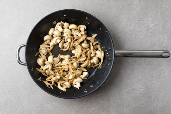 Die 1/2 des Knoblauchs in einer großen Pfanne mit 1–2EL Olivenöl bei hoher Hitze ca. 30Sek. braten. Die Pilze hinzugeben und 3–5Min. anbraten. Mit Salz und Pfeffer würzen.