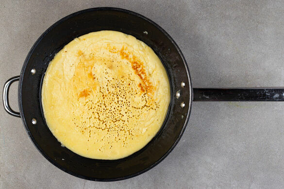 Die Ränder des Pfannkuchens anheben, um zu prüfen, ob die Unterseite goldbraun gebraten ist. Den Pfannkuchen wenden und auf der anderen Seite 2–3Min. goldbraun ausbacken. Tipp: Wer nicht den ganzen Pfannkuchen auf einmal wenden möchte, kann ihn auch vorher zerteilen.