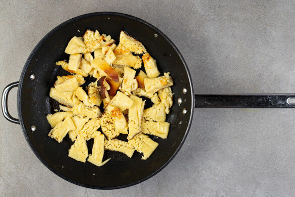 1EL Butter in der Pfanne bei niedriger bis mittlerer Hitze schmelzen. Den Teig zugeben und abgedeckt 6–8Min. ausbacken, dann den Deckel abnehmen und weiterbraten.