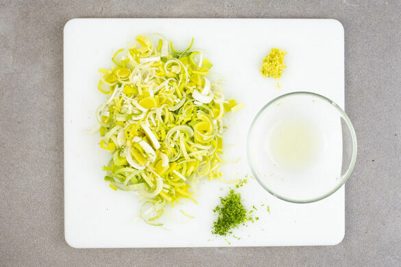 Den Lauch längs halbieren und quer in feine Streifen schneiden. Die Limettenschale abreiben, dann die Limette halbieren und auspressen. Ca. 1TL Ingwer schälen und fein reiben. Tipp: Wer mag, kann auch mehr Ingwer verwenden.