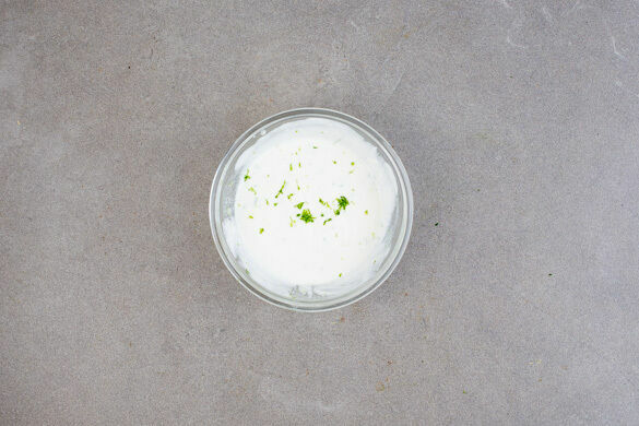 Den Joghurt mit ½TL Limettenschale, 1EL Limettensaft sowie je 1 Prise Salz und Pfeffer verrühren. Den Dip bis zum Servieren kühl stellen.