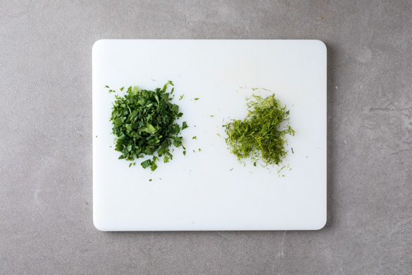 Die Petersilienblätter und die Dillspitzen von den Stängeln zupfen und fein hacken.