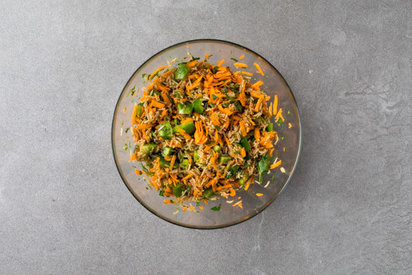 Heute in deiner Box: zartes Hühnchen, das in der Pfanne mit Champignons angebraten wird, dazu ein knackig-frischer Reissalat mit Karotte, Paprika und frischen Kräutern. Der Basmati-Vollkornreis hat einen tollen, nussigen Geschmack und kocht zwar ein kleines bisschen länger als andere Reissorten, dafür geht der Rest aber umso schneller.
