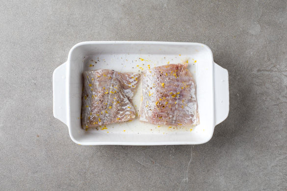 Den Backofen auf 230°C Umluft (250°C Ober-/Unterhitze) vorheizen. Den Seelachs in 2 Stücke schneiden, mit 1–2TL Olivenöl einreiben und in eine Auflaufform legen. Die Zitronenschale abreiben, die Zitrone halbieren und auspressen. Den Fisch mit 1–2EL Zitronensaft beträufeln und mit 1–2TL Zitronenschale, Salz und Pfeffer würzen. Die Form mit Alufolie abdecken.