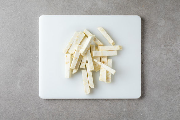 Den Sellerie mit einem Messer schälen und in ca. 1cm dünne Scheiben schneiden, anschließend diese in ca. 1cm dünne Stifte schneiden.