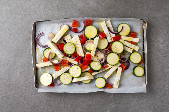 Die Zwiebeln, den Sellerie, die Zucchini und die Paprika mit etwas Olivenöl, Salz und Pfeffer vermengen und auf einem mit Backpapier ausgelegten Backblech verteilen. Im Ofen ca. 20–25Min. rösten.