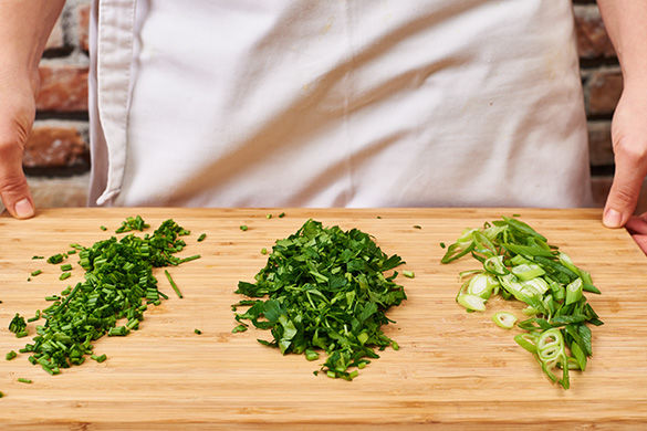 Währenddessen den grünen Teil der Lauchzwiebeln ebenfalls in sehr feine Röllchen schneiden. Die Petersilie samt Stängeln fein hacken. Den Schnittlauch in feine Röllchen schneiden.