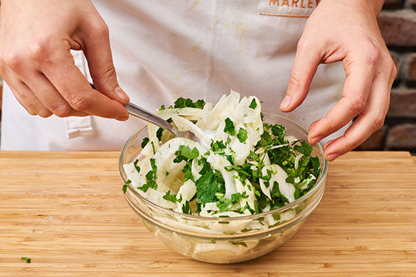 Den Saft einer 1/2 Zitrone auspressen. Den Fenchel in möglichst feine Streifen schneiden, dabei den Strunk entfernen, und mit der Petersilie, 2EL Zitronensaft und 1EL Olivenöl mischen. Mit Salz und Pfeffer und nach Geschmack mit mehr Zitronensaft abschmecken. Die Kürbisrösti mit dem Fenchelsalat und dem Joghurtdip servieren.