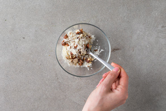 Die Haselnüsse in einer kleinen Pfanne bei mittlerer Hitze ohne Fett anrösten. Vorsicht: Die Nüsse können schnell verbrennen. Anschließend die Nüsse grob hacken. Den Käse fein reiben, mit den Nüssen vermengen und die Nuss-Käse-Mischung mit Salz und Pfeffer würzen.