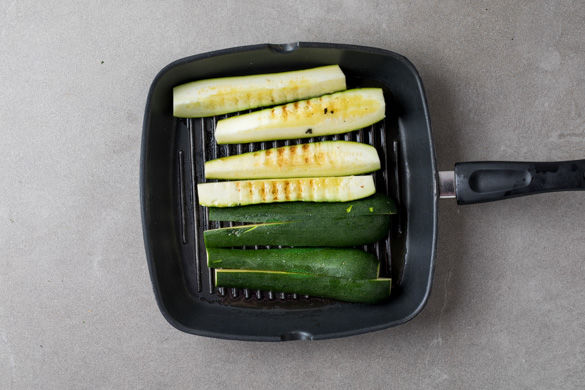 Die Enden der Zucchini abschneiden, dann die Zucchini der Länge nach vierteln und mit 1EL Olivenöl einreiben. Eine Grillpfanne bei mittlerer Hitze erwärmen und die Zucchini ca. 1–2Min. anbraten, bis leichte Röstspuren zu sehen sind.
