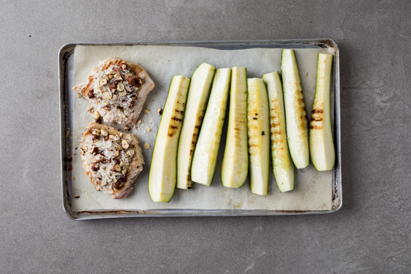 In derselben Pfanne die Schweinesteaks von jeder Seite 2–3Min. kross anbraten. Dann die Steaks und die Zucchini auf ein mit Backpapier ausgelegtes Backblech legen. Die Nuss-Käse-Mischung auf den Steaks verteilen und die Steaks und die Zucchini im Ofen ca. 10–12Min. backen, bis das Fleisch gar und der Käse geschmolzen ist.