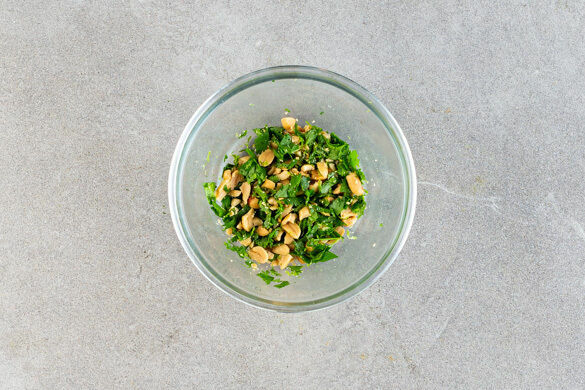 Die Erdnüsse grob hacken. Den Koriander samt Stängeln grob schneiden. Die Erdnüsse, den Koriander und die Limettenschale vermengen. Die Rindfleisch-Paprika-Pfanne auf dem Reis anrichten und mit den Koriander-Erdnüssen garniert servieren.