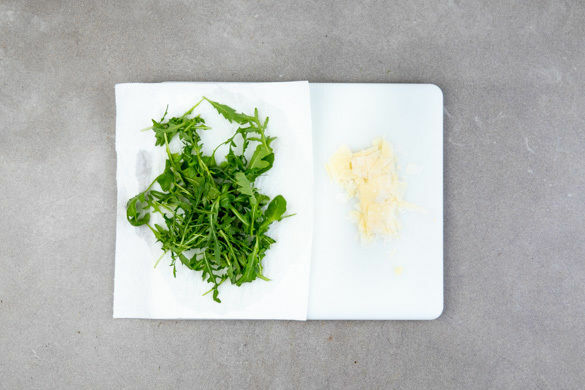 Den Rucola ggf. verlesen und den unteren Teil der Stiele abschneiden. Den Käse mit einem Sparschäler in dünne Scheiben schneiden.