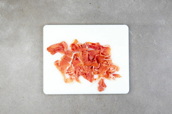 In einem großen Topf ausreichend gesalzenes Wasser für die Pasta zum Kochen bringen. Den Schinken mit den Fingern in mundgerechte, nicht zu kleine Stücke zupfen.