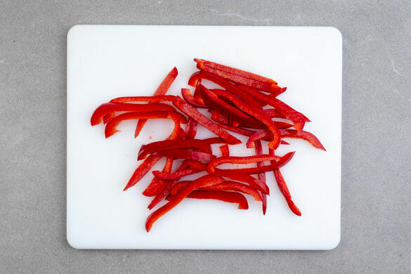 Den Backofen auf 220°C (200°C Umluft) vorheizen. In einem großen Topf ausreichend gesalzenes Wasser für die Pasta zum Kochen bringen. Die Paprika vierteln, entkernen und in dünne Streifen schneiden.