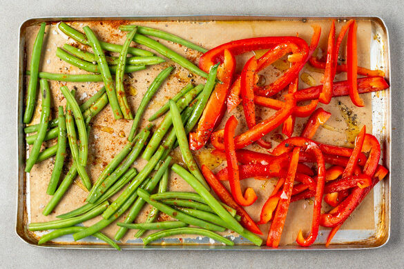 Die Paprika und Bohnen auf einem mit Backpapier ausgelegten Backblech mit 2EL Olivenöl, der Gewürzmischung und je 1 kräftigen Prise Salz und Pfeffer vermengen, gleichmäßig verteilen und 12–15Min. im Ofen rösten, bis die Bohnen goldbraun sind und das Gemüse gar ist.