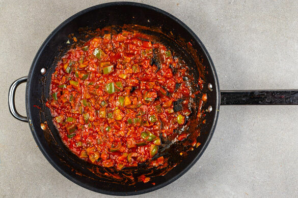 Das Tomatenmark und 100ml Wasser dazugeben, mit dem Gemüse vermengen und bei mittlerer bis starker Hitze aufkochen. Anschließend bei mittlerer Hitze 4–5Min. köcheln lassen, bis das Gemüse weich und die Flüssigkeit größtenteils verdampft ist.