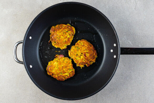 Die Böden von zwei großen Pfannen mit Pflanzenöl bedecken und das Öl bei mittlerer bis starker Hitze erwärmen. Mit einem großen Löffel portionsweise Teig in die Pfannen geben und die Bratlinge auf jeder Seite ca. 3Min. goldbraun anbraten. Mit Salz und Pfeffer würzen und auf Küchenkrepp abtropfen lassen. So fortfahren, bis der gesamte Teig aufgebraucht ist.